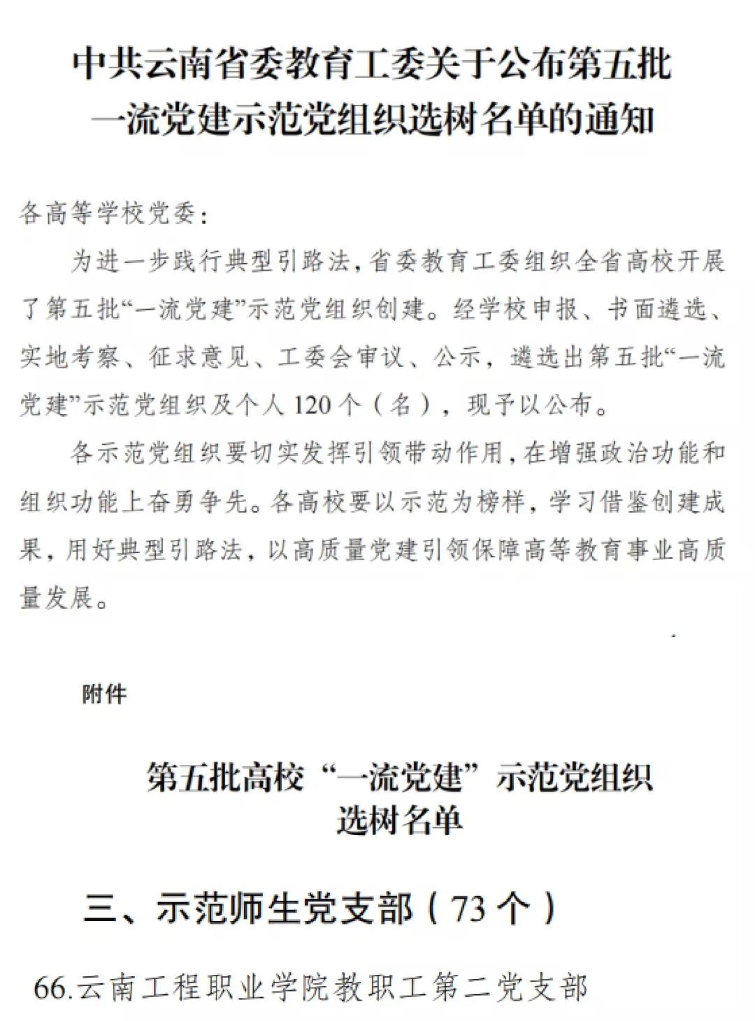 喜讯!学校教职工第二党支部经过严格评审,被选树为云南省第五批高校“一流党建”示范师生党支部!这一荣誉不仅是对学校党建工作的肯定与鼓励,更是今后党支部工作前行的动力和鞭策。